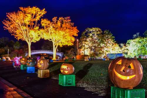 イベント期間中は園內もライトアップされ、遠景の木々や橋が照明に照らされてぼんやりと暗闇の中に浮かび上がりました。カボチャランタンの明かりとあいまって、この時にしかない幻想的な空間を作り出していたようです。
