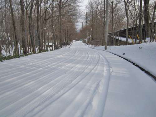 車の通らない歩道には雪が殘っておりますが