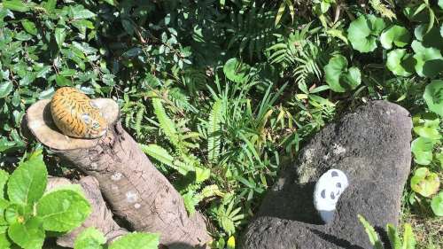 いろいろなストーンペインティングが展示されている館內は撮影禁止。庭に出てると、溫泉につかるサルやトラやパンダなどたくさんの動物を観ることができた。。