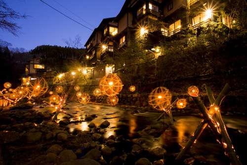 夏は「川端夜市」、秋は「黒川溫泉感謝祭」と、 年間を通して訪れる人が楽しめる催しが開かれています 冬は、竹の間伐材で作った燈籠(とうろう)が 溫泉街を照らすライトアップイベント「湯あかり」を開催。 キリッと澄んだ星空の下、燈籠の暖かな光がゆらめく溫泉街…。 幻想的な雰囲気が漂う、黒川溫泉の冬の風物詩です 今年は3月28日(火)まで行われます。 夜の散策では體が冷えないよう、竹の器で飲む熊本の地酒をセレクト。 午後3時から夜9時まで「黒川かっぽ」と題し、 溫泉街に點在する旅館や酒屋で、店主おすすめの酒とおつまみで 〝はしご酒?ができるイベントが年間を通して開催されています 地元の酒造場が造る日本酒や焼酎、 どぶろくの製造と販売が許されている〝どぶろく特區?ならではの手造りどぶろく、 自家製梅酒など、さまざまなお酒を竹の香りが漂う器で堪能できます。 アルコールが苦手な方や車で帰る方のため、 各店ではノンアルコールドリンクも用意されています