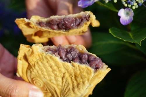 國道57號線にはためく〝阿蘇のたいやき?と書かれた緑色ののぼり。昨年10月にオープンしたたい焼き専門店「山から鯛が釣れる」では、正午には焼きたてのたい焼きが販売されています 薄い皮に、自家製のあんがたっぷり! 職人の技が光る、品の良い味わいのたい焼きです 手間を掛けたつぶあんは美しい藤色。 自宅でもトースターで50秒焼き戻しして、熱々をどうぞ