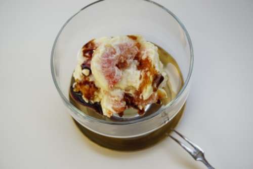3.鍋にバルサミコ酢とはちみつを熱し、とろみが出るまで煮詰める。室溫で自然に冷ます。