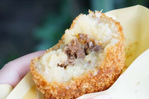通りに漂う揚(yáng)げ物の香りに導(dǎo)かれて、創(chuàng)業(yè)60年以上の老舗精肉店『阿蘇とり宮』へ。手作りの総菜も販売していて、一番人気はじゃがいもと馬ひき肉で作るコロッケ「馬(ば)ロッケ」。注文後に揚(yáng)げてくれるのでアツアツを食べることができます。衣はサクッとしていて、中はホクホク! 甘辛く煮てある馬ひき肉の濃い旨味に食が進(jìn)みます。「地元の方はご飯のおかずにまとめ買いされますよ」と代表の杉本真也さん。炊きたてのご飯によく合いそうです。 酒屋前にある水基「酒杜の水」。かつては造り酒屋だったことが名前の由來だそう 馬ロッケ(180円)は熱々をどうぞ。店の奧には2つの水基「とり宮の泉」「絆の水」があるので、食後に探してみましょう