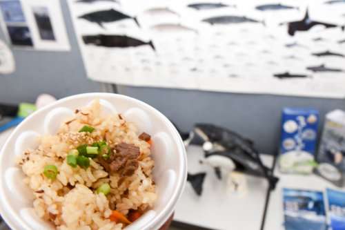 その場で食べられる鯨料理も毎年販売されます。今年は、鯨の炊き込みご飯という珍しい料理が出品されました。鯨肉特有の鉄分くささが気にならず、普通においしい炊き込みご飯として食べられました。