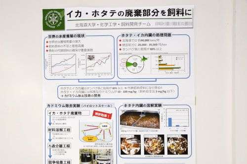 學(xué)生さんたちの研究成果などをまとめたポスター展示もありました。なかでも、大半が産業(yè)廃棄物として捨てられているホタテの卵巣とイカの內(nèi)臓を飼料として使う研究には興味を引かれました。どちらも道南地域では大量に捨てられているので、少しでも活用されるといいですね。