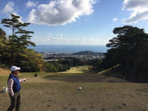 別府灣と別府の街を見下ろす絶景のホール、ティショット前に