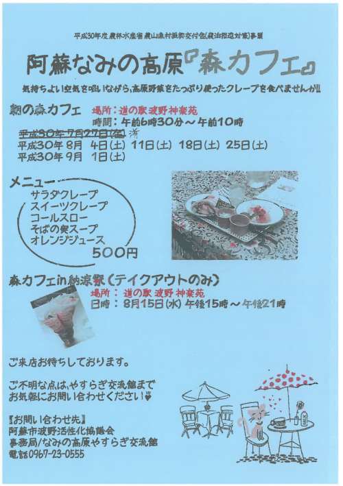 平成30年8月の毎週土曜日と平成30年9月1日土曜日まで、新企畫の『森カフェ』がオープンするそうです