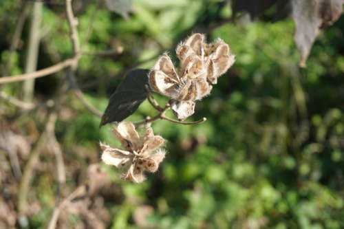 初夏にハイビスカスやオクラによく似た黃色い花を咲かせていた綿が、いつの間にか果実をつけて、はじけていた。