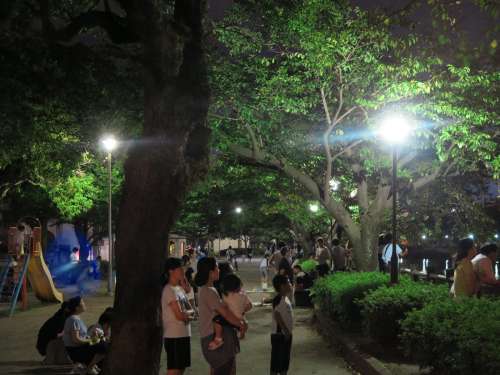 (甲突川、河川敷の様子) (19:30 火の玉大爆発 打ち上げ開始)