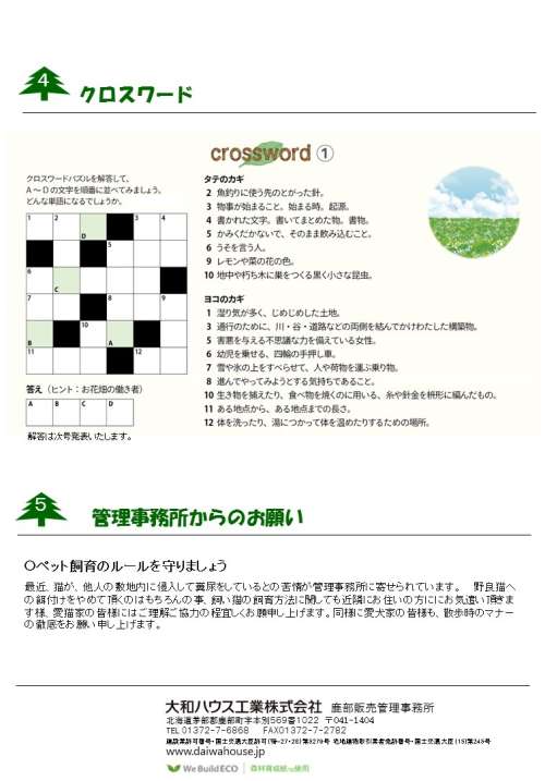 最近、貓が他人の敷地內に侵入して糞尿をしているとの苦情が管理事務所に寄せられています。野良貓への餌付けをやめて頂くのはもちろんの事、飼い貓の飼育方法に関しても近隣にお住いのかたにお気遣い頂きますよう、愛貓家の皆様にはご理解ご協力の程宜しくお願い申し上げます。同様に愛犬家の皆様も散歩時のマナーの徹底をお願い申し上げます。