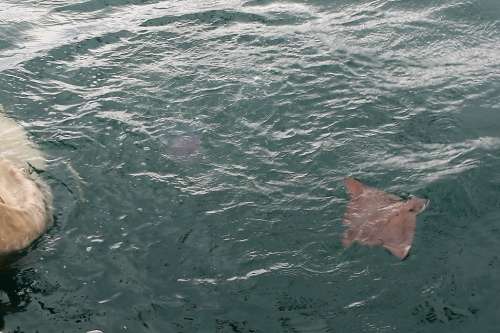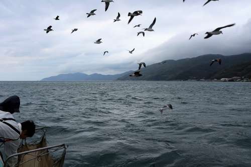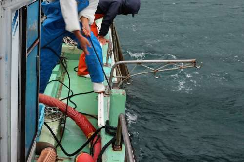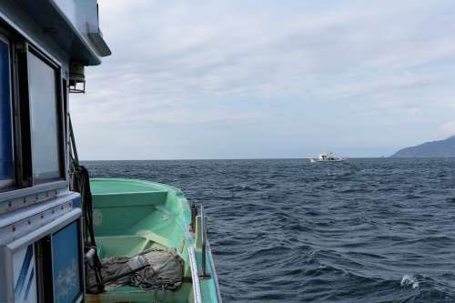 先に網(wǎng)を仕掛けて待つ2隻の漁船と合流して