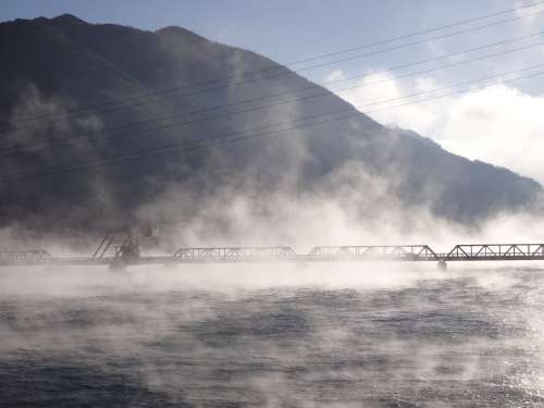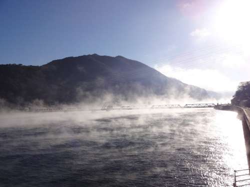 肱川あらしとは、晴れた日の朝、上流の大洲盆地で涵養された冷気が霧を伴って肱川沿いを一気