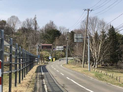 手前の街路燈右側(cè)に黃色い看板と奧に電光掲示板があり山頂付近の道路狀況