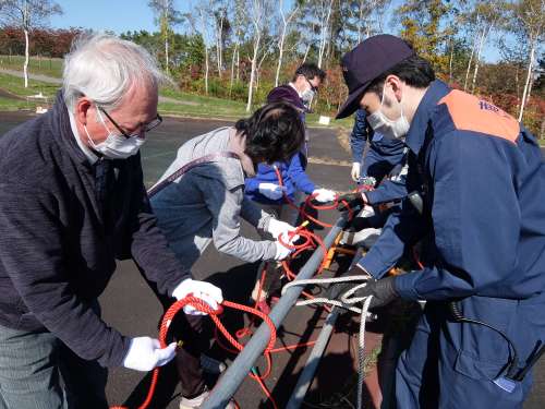 防災イベントでは、鹿部消防署の職員さんから訓練用の消火器を使用した消火訓練とロープワークの実技研修をしていただきました