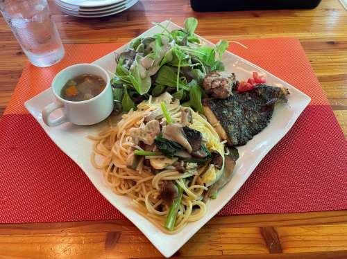 スープやサラダ、お魚もついていて、緑の中でゆっくりと食事をとる事が出來ました