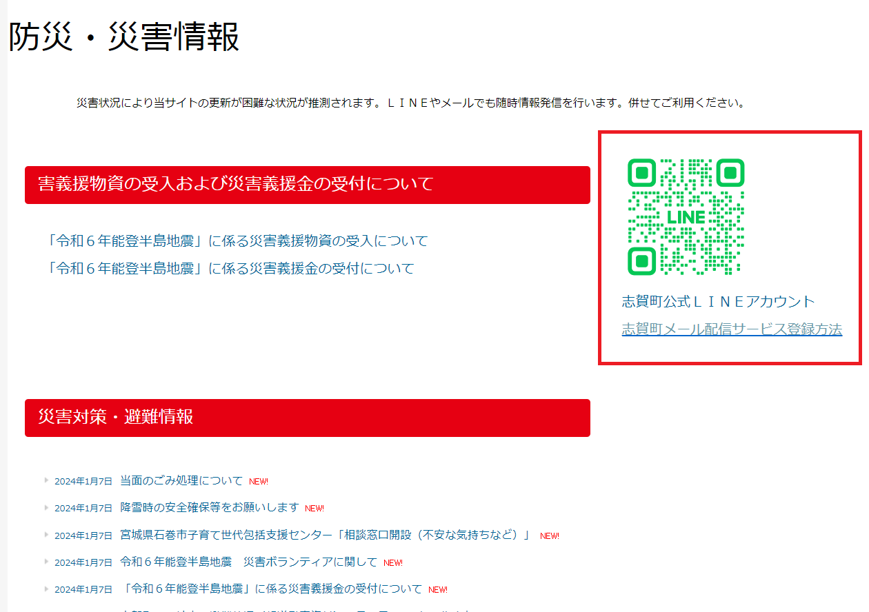 ?燃えるごみ:液體の回収は不可。必ず凝固剤で固めてから排出願います。 災害に伴い燃えるゴミの処理手數料が免除されます。 當分の間、ごみ処理券(シール)を貼っていない場合でも収集されます。 45Lまでの大きさ、透明又は半透明の袋で、分別の徹底にご協力をお願いします。 ※ごみに関する情報は下記志賀町HP、志賀町情報配信サイトより詳細をご確認いただけます ============= ============= 引き続き、森林住宅地內の安全確認を実施してまいりますので、ご理解とご協力をお願いいたします。 志賀町HPによる災害情報は下記をご參照ください。 ※各情報が更新されると1つ前の公開ページは消えてしまうため、志賀町役場HPのTOPページをご確認ください ■志賀町役場HP ※たくさんの方がアクセスしておりすぐには繋がりにくい狀況です https://www.town.shika.lg.jp/ ■志賀町情報配信サイト https://shika-town.site.ktaiwork.jp/ ■志賀町公式LINE 下記畫像(志賀町役場HP)內、の赤枠部分より登録可能。オンタイムで役場情報が通知されます。 上記HPから志賀町役場公式LINE、役場配信メールの登録が可能です。