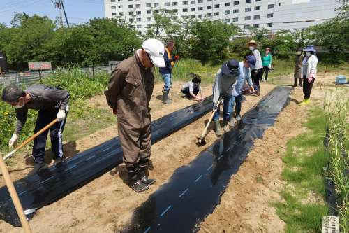 次に黒マルチを張り、鍬で押さえていきます。