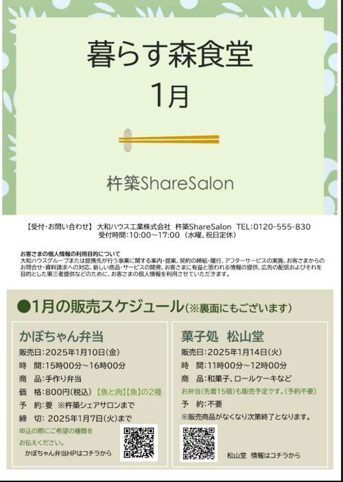 暮らす森食堂 1月の ご案內です。 ご予約が 必要なものも ございますので、 ご希望の方は、お早めのご予約を お願い申し上げます。 ※ オーナー様限定の企畫となっております。