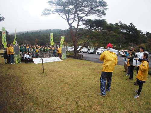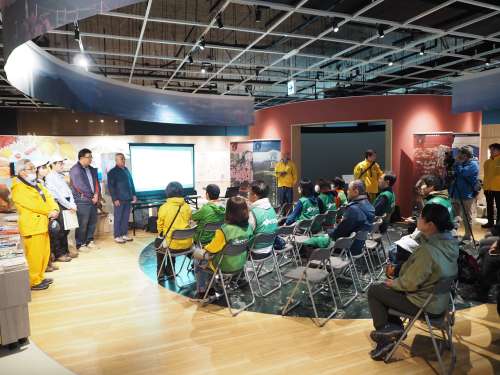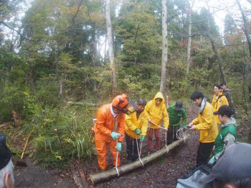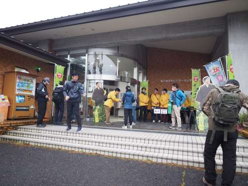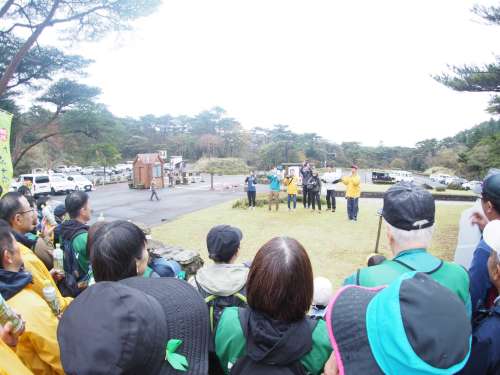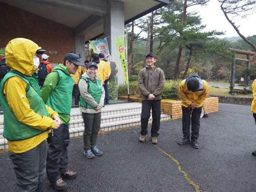 挨拶とレクチャーのあと 3つの班に分かれて山の中へ出発。