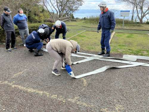 次は最初のむかいパーク駐車場にもどり、消火ホースの使い方をみなさん