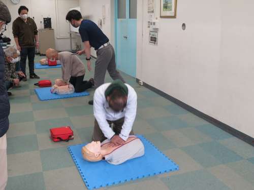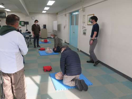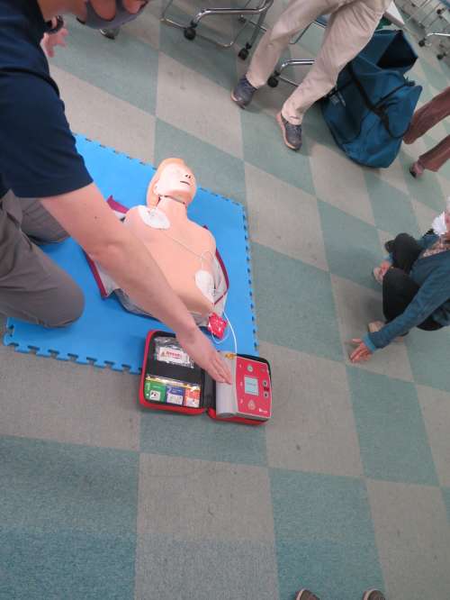 今回の講習の內容は①心肺蘇生方法②AED取扱い方法③異物除去方法に ついてです。講演の前に救命士から救命手當てについて「心肺停止の予防」⇒ 「早期発見」⇒「一次救命」⇒「二次救命」について學びました。