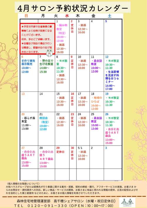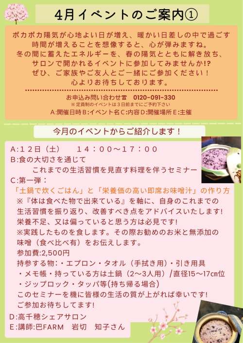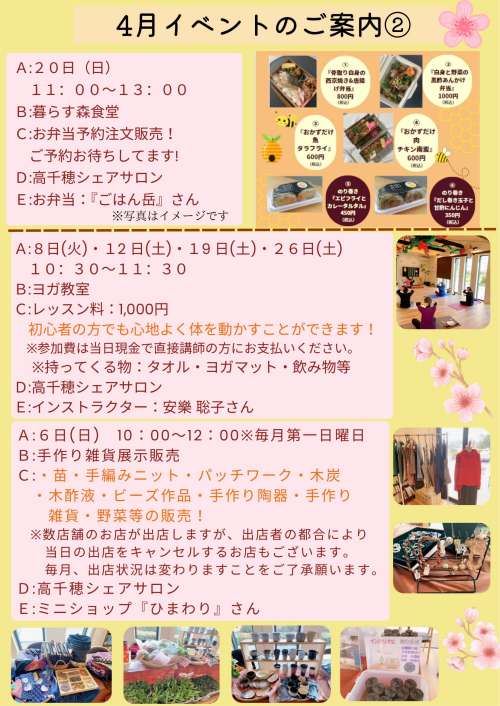 『4月のイベント案內』と『暮らす森食堂』情報を