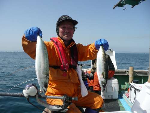 後ろのほうから、すぐに、きたでーと聲が上がり、ほとんど間をおかずに、バタバタと皆のロッドが激しく上下します。やや小ぶりですが、サバが皆さんに行き渡りました。2~3本同サイズのサバのあと、アジが幾つか続き、ややあって、左舷後方で、大サバが來たようです。