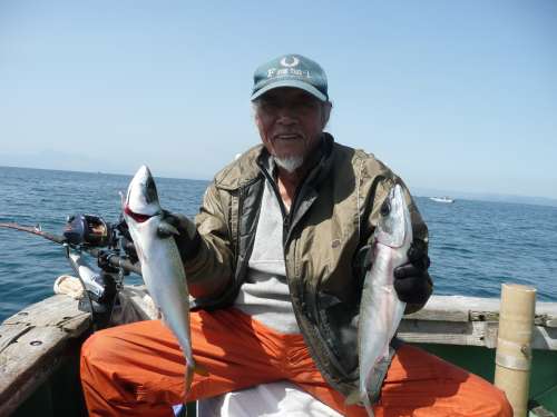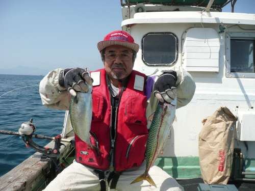 それでも、ぱったりとアタりが止まる瞬間があり、群れが通り過ぎるとみなさんのロッドが、まっすぐに船べりから直角に伸びているのが、へんに普通に思えるのですね。この時にしか、デジカメのシャッターを押すチャンスがないので、皆さんにそれぞれサバを持っていただいて寫真に収めました。