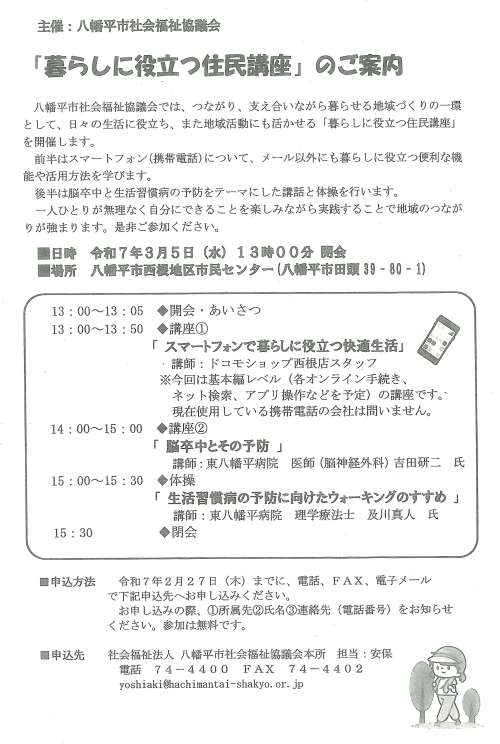 暮らしに役立つ住民講座のご案內 <主催:八幡平市社會福祉協議會>