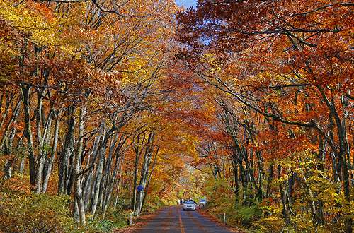 ブナのトンネル 二の沢から三の沢にかけての大山パークウェイは 別名「ブナのトンネル」。ただこの季節だけ、 紅葉のトンネルとして真っ赤なアーチの下をドライブすることも可能です。 (別荘地より約15.1km 平成22年11月1日撮影)