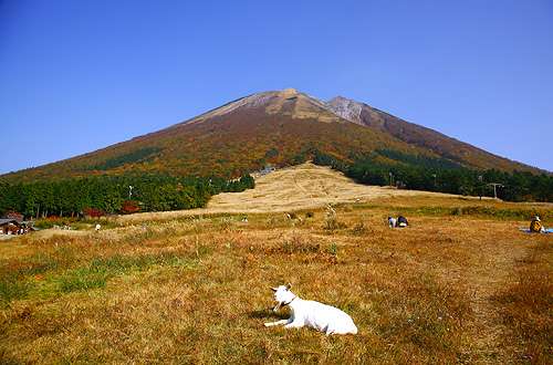 豪円山のろし臺 大山の北壁。駐車場に車をとめアーチ狀になった散策道を歩くこと5分。 目の前にはスイスの牧歌的風景を彷彿させるかのような絶景が。 この時期、スキー場を縁取る紅葉のシュプールを確認できます。 (別荘地より約8.7km 平成22年11月2日撮影)