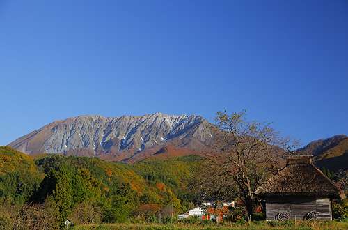 御機集落 茅葺屋根の建物が印象的なこちら。 田舎ならではの紅葉風景とそびえる大山の南壁が絶妙のコントラスト。 (別荘地より約18.2km 平成22年11月1日撮影)