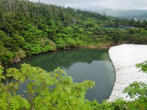 帰りは來た道と違う道をたどります。殘雪のメガネ沼や鏡沼を眺めながら汗もひき、すがすがしい気分で車まで戻りました。