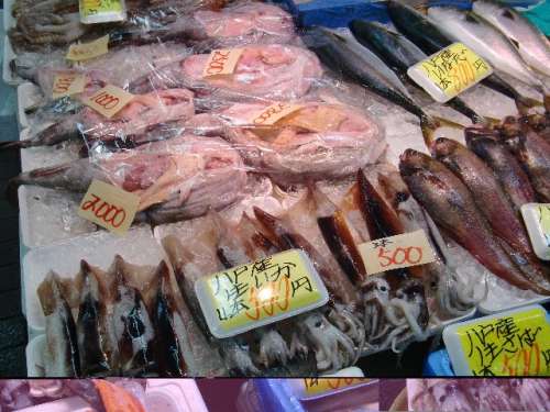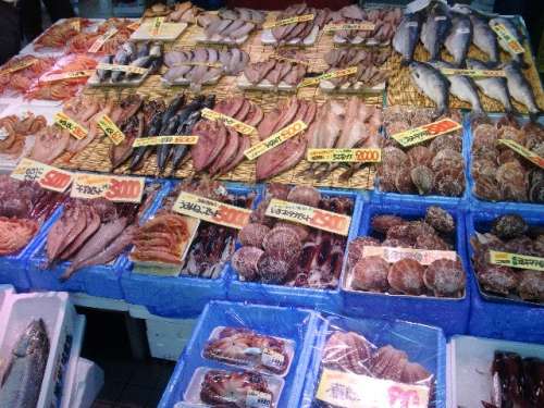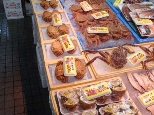 腹ごしらえも済み市場の中を歩いて見ます、新鮮な魚がずらりと並んでいます。カニ、イカ、ホタテ、サバ???etc