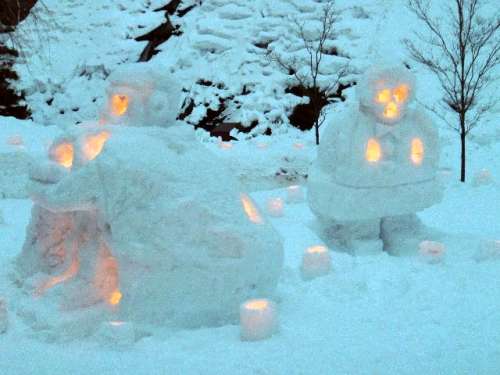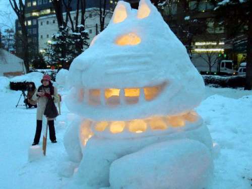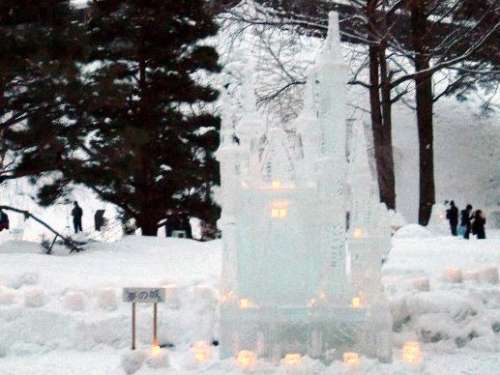 「いゃぁ、ごめんなさい」次の雪像へと進みます、「イーハトーブの小學校」、「夢の城」など力作が並んでいます