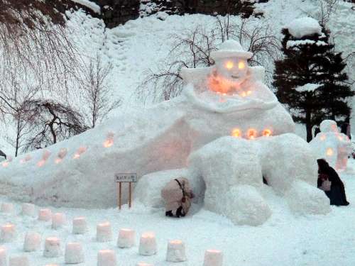 様々な雪像や盛岡にちなんだ氷の彫刻がライトアップされた盛岡城の石垣に華を添えています