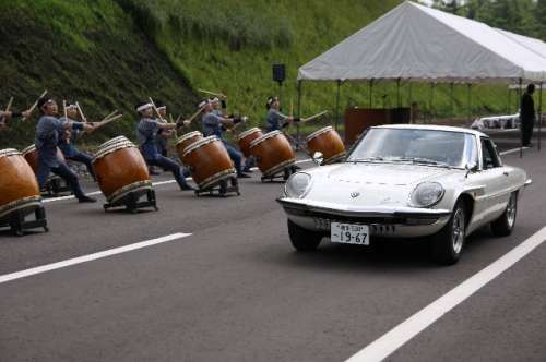 開通式は午前10時から、県道焼走り線側で行われました。地元?松川一の宮太鼓の威勢のいい演奏で始まり、関係者の挨拶、愛稱『巖手山パノラマライン』の名付け親となった地元の中學生への記念品贈呈、テープカットの後、走り初めとなりました。関係者が乗った車両に続き、巖手、秋田、青森から馳せ參じたクラッシクカーのパレードも行われました。懐かしいブルーバードやら、スカイラインやら28臺の、記念疾走となりました。
