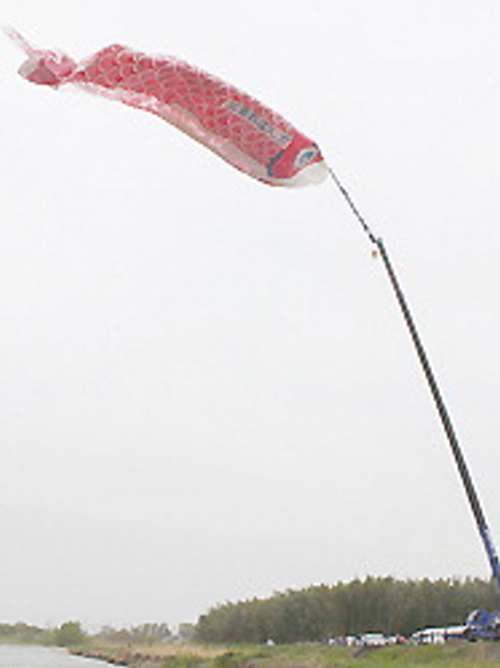 これは滋賀県長浜市の“雨森まちづくり委員會”が企畫し被災地復興を願って行ったイベントの“鯉のぼり”でイベント終了後、宮古市に運ばれこの宮古灣の岸壁で元気良く高さ50mまでクレーンで吊り上げられて宮古市民にエールを送っています。