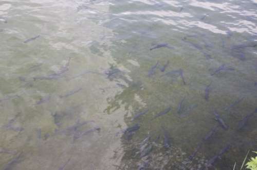 釣堀りには、清涼な名水で育てられたニジマスやイワナが見事なほどたくさん泳いでいます。そうそう、マスは英語でtrout、トラウトです。これがそのまま施設名となっているんですネ。