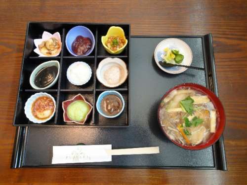 全國でも珍しいつきたての餅料理が伝統食であり最高のおもてなし料理でもある一関地方。 この地方では冠婚葬祭、季節の行事、人生の節目ごとにお餅をつきます「もち暦」には年間60日ものお餅をつく日の記載があったそうです。 一関地方のもち料理は伊達藩時代の治世に由來します。 伊達藩では年貢米の査定として毎月1日と15日に餅をついて神様に供えることを課し、平安息災を祈ると共に休息日とする習わしがありました。 當時の貧しい農民たちは神様には白い餅を供えても自分たちは白い餅を食べることはできませんでした。 そこで落ち穂や青米、くず米などを粉にして練り合わせ、雑穀をまぜて搗いた「しいなもち」とよばれる餅を食べました。 この「しいなもち」をよりおいしく食べようと試行錯誤を重ね結果生まれたのが様々なもち料理だといわれたいます。 具材は保存食として身近にあった小豆、大豆、ごま、季節の素材の山菜やきのこ、さらには海や河、沼の魚介類などなど??? 先人たちの知恵と工夫の賜物であるもち料理は実に多彩です、次第にもち料理は農作業の區切りだけでなく、季節の行事、人生の節目などに欠かせないものとなっていきました。 一関の冠婚葬祭にはもち料理が欠かせません。その際供されるのが「もち本膳」です、これは日本料理の最高の格式である本膳料理の一汁三菜を餅だけで調えた、一関地方獨特のものです。 そんな多彩な伝統もち料理を気軽に召し上がっていただけるようにと考案したのが「ひと口もち膳」だそうです。 「ひと口もち膳」を食べに一関の駅前にある『三彩館ふじせい』さんを訪ねました。