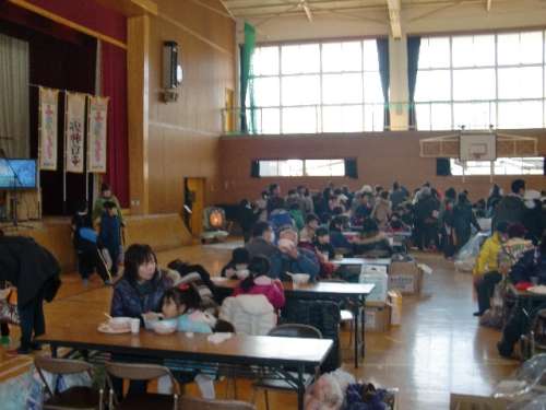 しかし、一緒に出掛け小學校に著くや否やもう私は止りません、靴を脫てて、會場の中に入ります、そこは、宮古市民で満員御禮狀態です