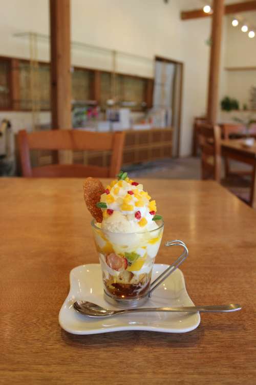 フードメニューは“お茶に合う食べ物”を條件にご夫婦で試作を重ねた自信作小國米を使った「茶のこのお晝ごはん」1260円)や、抹茶に小國ジャージー牛乳で作る自家製バニラアイスを浮かべた「ミルクロード」735円)、手作りの杏仁豆腐やライチティーのゼリーを盛る「杏仁フルーツパフェ」892円)…。いずれも、「それぞれご贔屓のお客様がいるんです。なので、品數は増える一方です」と松崎さんは笑います