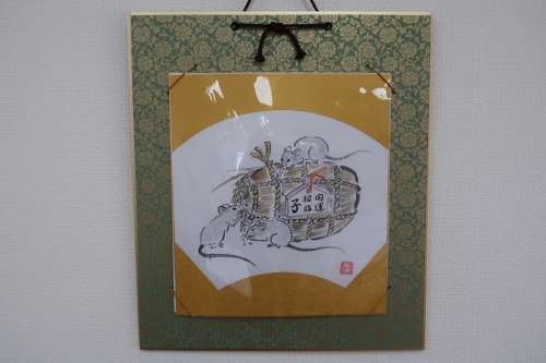今年の干支のネズミの絵と稲穂や松?正月飾りなど、おめでたい正月リースです