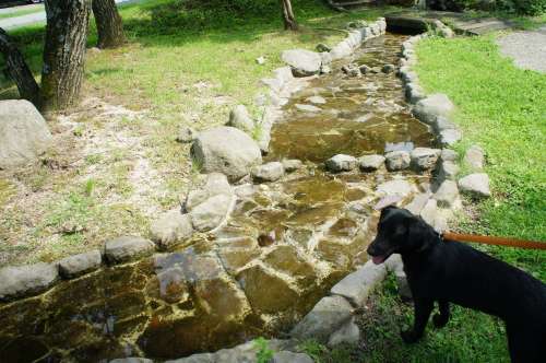 流れる水に興味深々なゴマちゃん