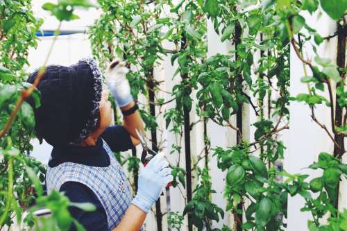 実際にバジルを収穫している女性の方に協(xié)力してもらい、収穫シーンを見(jiàn)せていただきました。