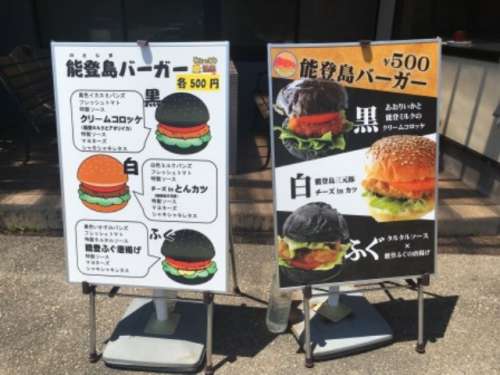 途中、「ひょっこり溫泉 島の湯」というところで寄り道して「のとじまバーガー」を體験。珍しい「ふぐバーガー」を賞味しました。バンズが黒くてエグ味を感じさせますが、お味はあっさりして美味でした。