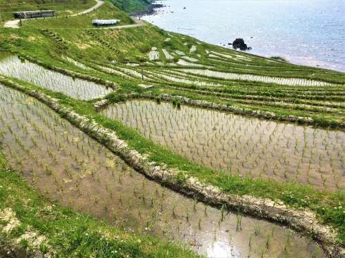 さらに北上しトトロ巖を経て、千枚田※3へ。 有名な場所なので、誰しも1度は寫真を見たことがあるのでは。 現地で実際に目にすると、思ったほど広い田畑ではありません。しかし日本海と相対するように開けた眺望はなかなかどうして、一見の価値ありだと思いました。 その証拠に有名人の名前入りの表柱が目につきます。この方たちは年會費を納めている田んぼのオーナーさんたちだそうです。 そう言えば小泉さんは首相時代、この棚田を見て「絶景だよ、絶景」と感嘆したのだそうですよ。