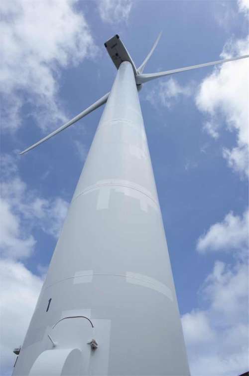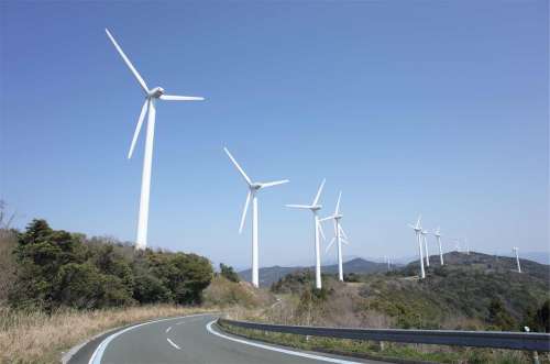 NASA の展示物のようにも見える風車の羽(分譲地から約3km) 青空にそびえる風車(分譲地から約3km)