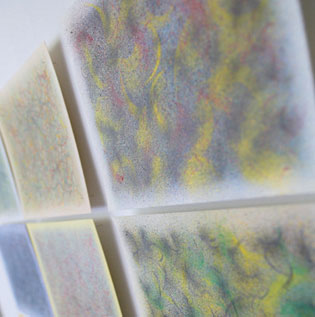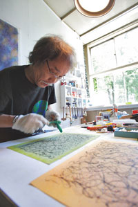 アクリル絵の具に刻みを付けた木片を浸し、それを弾き飛び散らせて描くスプラッシュ技法は、ゴトウさんのオリジナル。