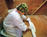 「同じはっとでも、ソバ生地はすぐにのして食べられるけど、小麥粉生地は足で20分くらい踏んだ後に一晩寢かせてからのすので、手間も時間もかかったんです。だから子どもの頃はそばを食べる機會の方が多かったですね」と坂本ゆき子さん。町內で唯一「ひぼがはっとう」(雑穀ご飯?小鉢?漬物付きで630円)を提供する産直?農村レストラン「みち草の驛」で、10年前の開店時からはっと作りを擔當しています。